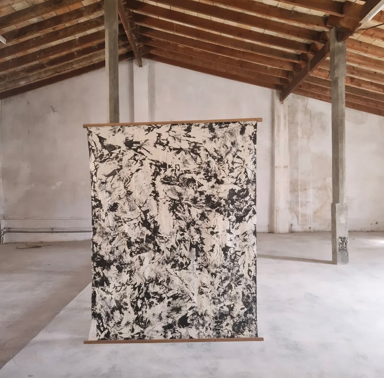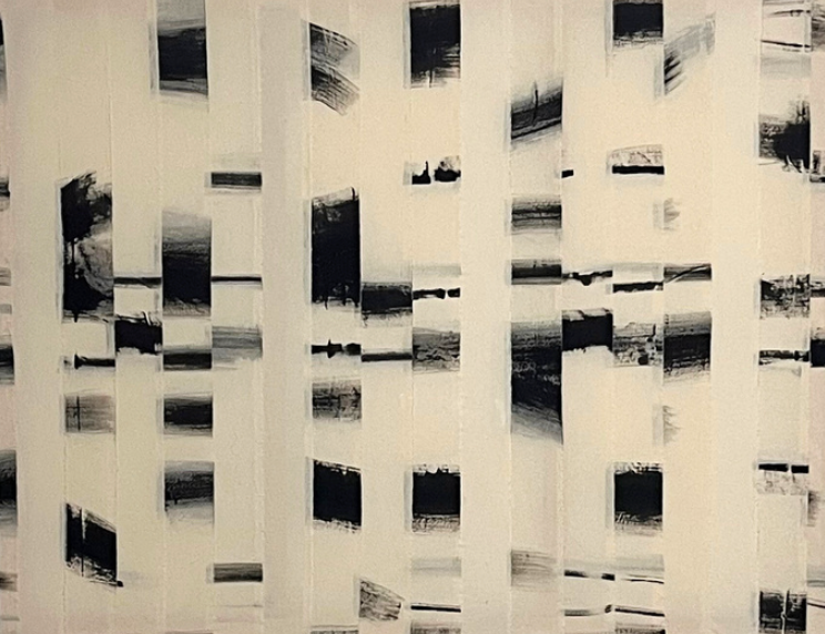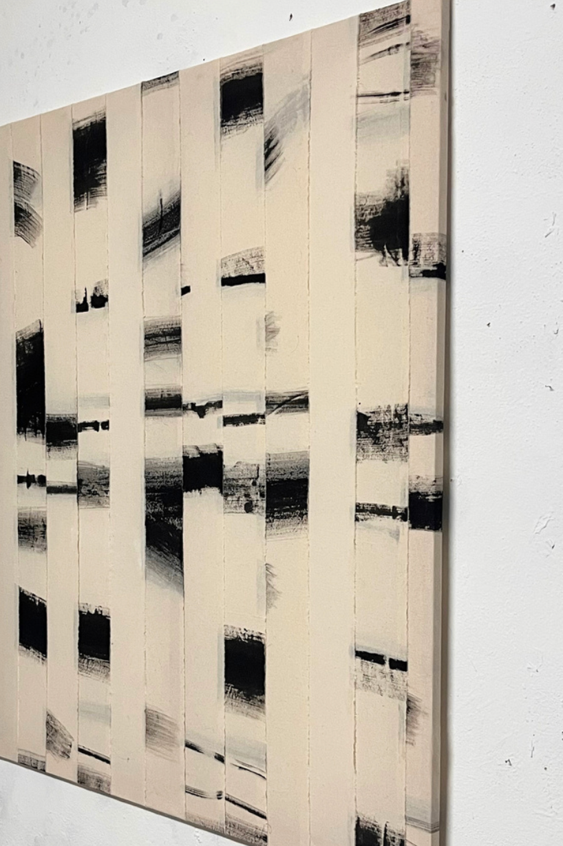 Glitch by Nieves Guri transcends the boundaries of traditional painting, delivering a bold visual impact. Crafted with ink on cotton canvas and enriched through collage techniques, its striking black-and-white patterns evoke the sensation of a distorted signal, capturing the viewer’s gaze and inviting endless interpretation.