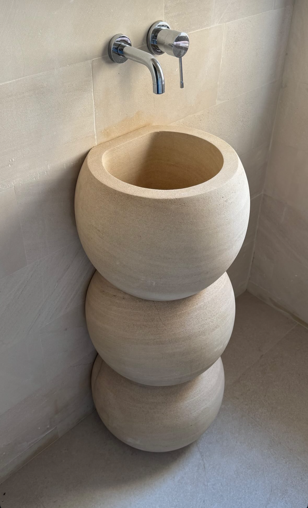 Discover Nube, an exquisite organic stone sink in Santanyí stone from Mallorca. Its gentle, sculptural forms offer a refreshing break from traditional designs, infusing your bathroom with warmth and a distinct artistic touch. Elevate your space with this unique piece. Designed by Marie Oehm.