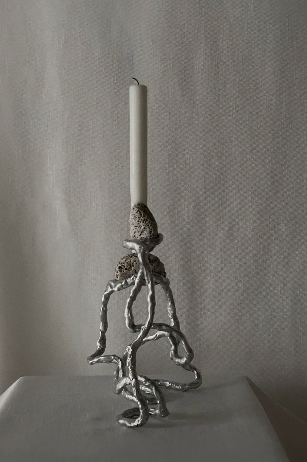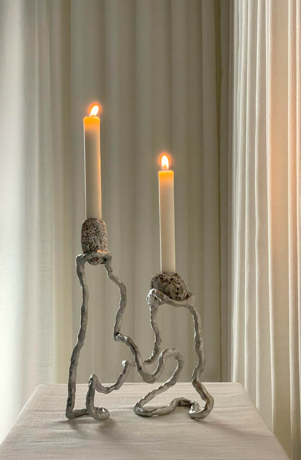 Beyond a mere candlestick, SYNC 02.01 is a breathtaking sculpture by Sofia Karnukaeva. Its expressive, organic lines, crafted from white stoneware and aluminum, demand attention. Watch as candlelight dances, creating an atmosphere of sophisticated allure.